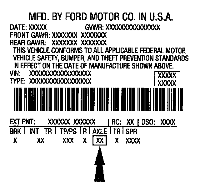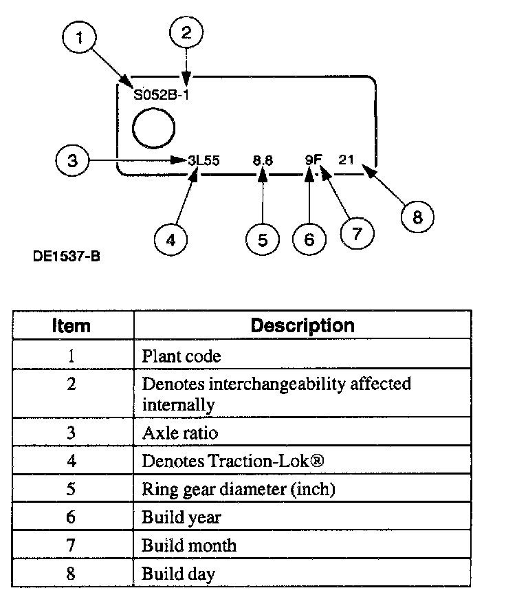 The axle identification tag identifies a particular axle design, a specific ratio, and if it is a conventional or limited slip (Traction-Lok(R)) type. In addition, the plant code will not change as long as that particular axle assembly never undergoes an external design change. If, however, an internal design change takes place during the production life of the axle and that internal change affects parts interchangeability, a dash and numerical suffix is added to the plant code. This means that as an assembly both axles are interchangeable; however, internally they are different. Therefore, each requires different internal parts at the time of repair.