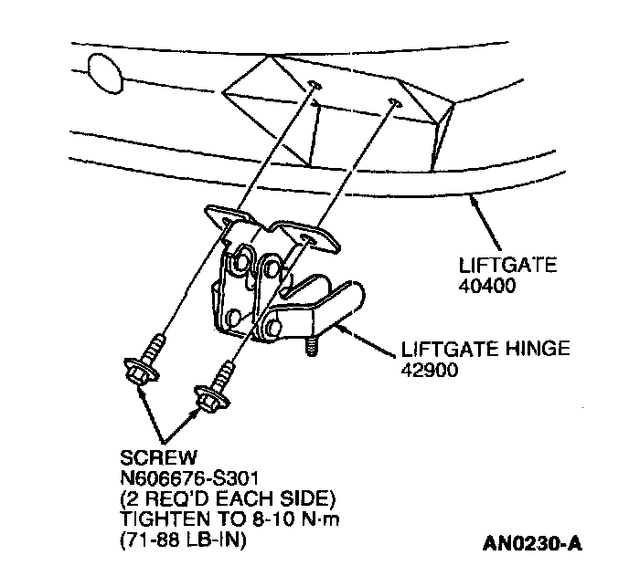 5. Tighten the hinge-to-liftgate screws to 8-10 Nm (71-88 lb-in).