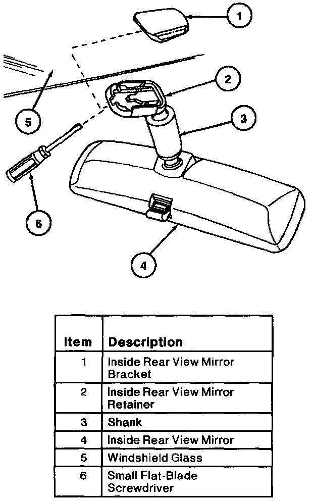 4. Pull screwdriver rearward until inside rear view mirror snaps off inside rear view mirror bracket.