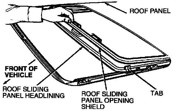3. Slide roof sliding panel opening shield forward, lifting it to clear roof sliding panel headlining.