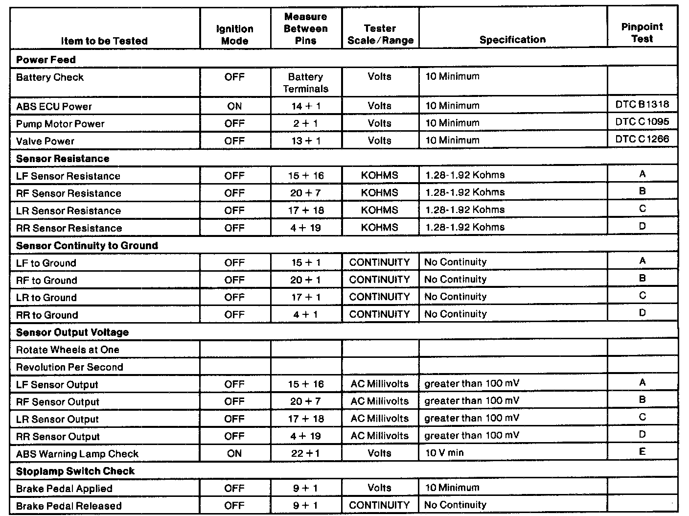 Anti-Lock Quick Test Check Sheet Using Rotunda 60-Pin EEC-IV Breakout Box 418-005 (014-00322) Or Equivalent: