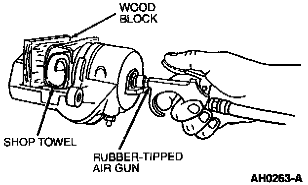 CAUTION: Do not use a screwdriver or any similar tool to pry caliper piston out of bore. It will result in damage to caliper piston. Cushion caliper piston's impact against disc brake caliper when blowing it out of bore by placing a wooden block or shop towels between caliper piston and caliper bridge. Use care because the caliper piston can develop considerable force from pressure buildup.