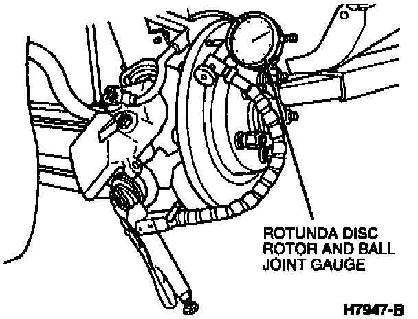 5. Attach Rotunda Disc Rotor and Ball Joint Gauge 134-R0199 or equivalent to some part of the vehicle suspension so the stylus of the indicator touches the surface of the disc brake rotor approximately 25.4 mm (1 inch) from outer edge of the disc brake rotor.