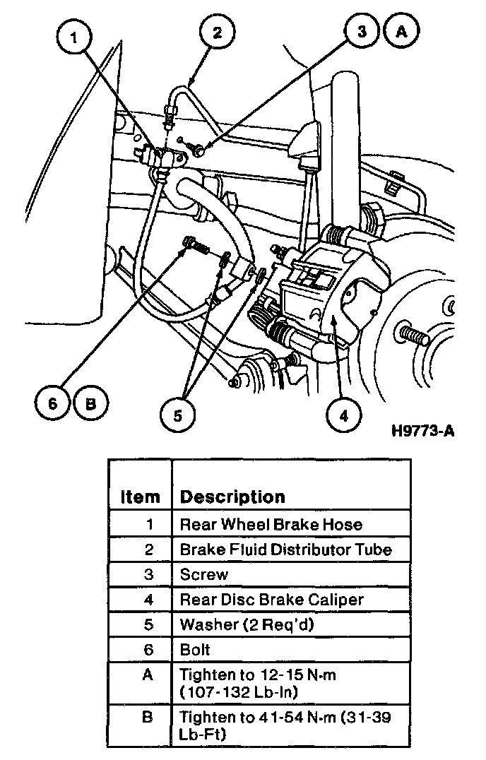 4. Using new washers, connect rear wheel brake hose to rear disc brake caliper. Tighten retaining bolt to 41 - 54 Nm (31 - 39 ft. lbs.).