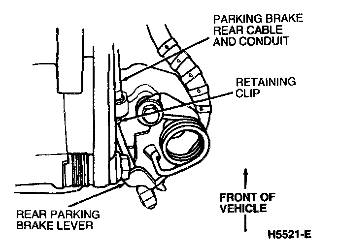 4. Remove retaining clip from parking brake rear cable and conduit at rear disc brake caliper.