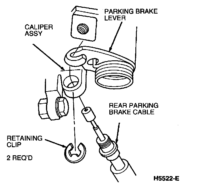 3. Attach cable end to parking brake lever. Install cable retaining clip on rear disc brake caliper assembly.