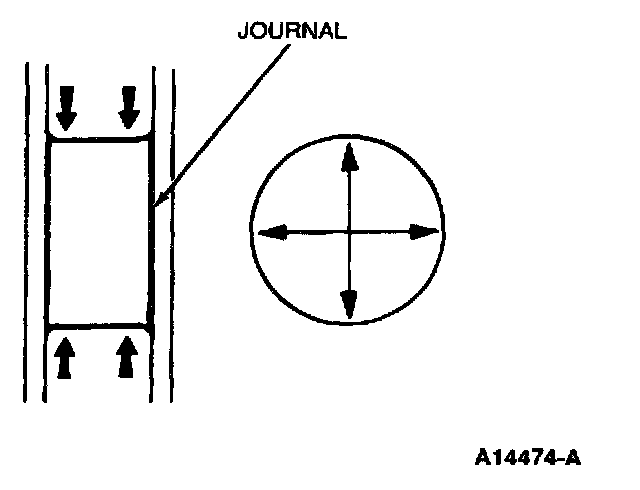 Inspect the main journal and connecting rod journal diameters. Measure the diameter of each journal at two different points in the directions as shown: