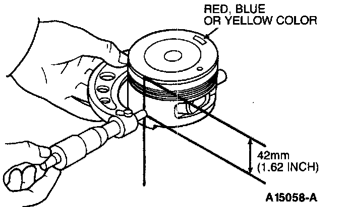 Measure the piston diameter using a micrometer. Measure piston skirt diameter 90 degrees to piston pin center axis, 42 mm (1.65 inches) from piston dome. It may be necessary periodically to use another piston (within the same grade size) that is either slightly larger or smaller to achieve the specified clearance.