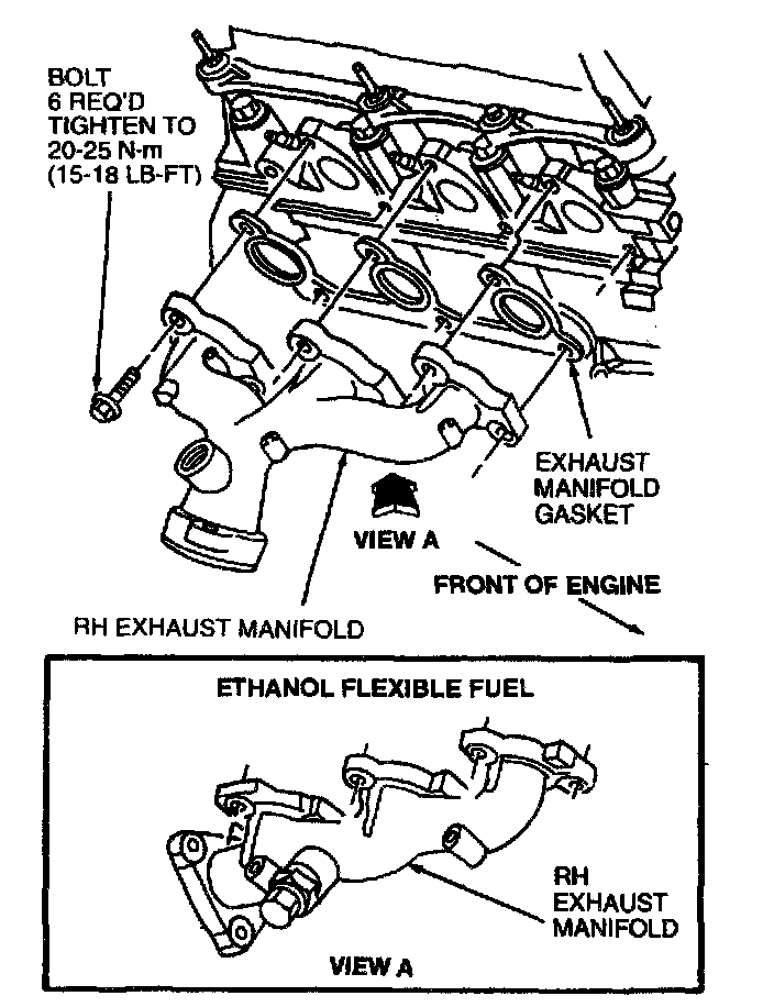 6. Remove exhaust manifold retaining bolts. Remove RH exhaust manifold and exhaust manifold gasket.