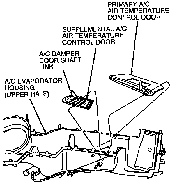2. Engage A/C damper door shaft link to primary A/C air temperature control door and position door into upper half of A/C evaporator housing.