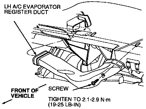 2. Remove retaining screw and LH A/C evaporator register duct from instrument panel.
