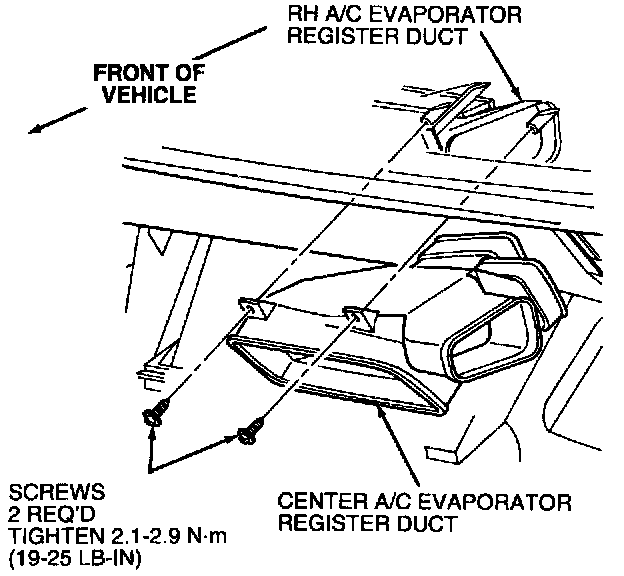 3. Remove two screws retaining center A/C evaporator register duct to instrument panel.