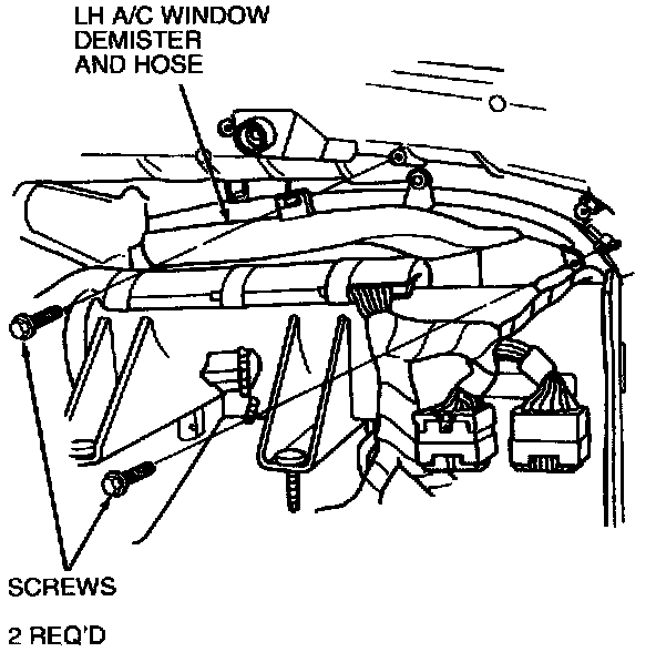 Remove two screws retaining LH A/C side window demister and hose to instrument panel and remove from instrument panel.