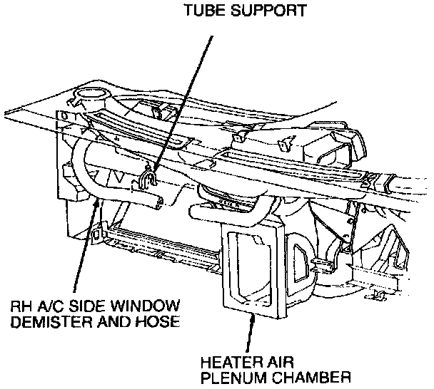 2. Disconnect RH A/C side window demister and hose from A/C accumulator tube support clip and A/C plenum demister adapter on heater air plenum chamber.