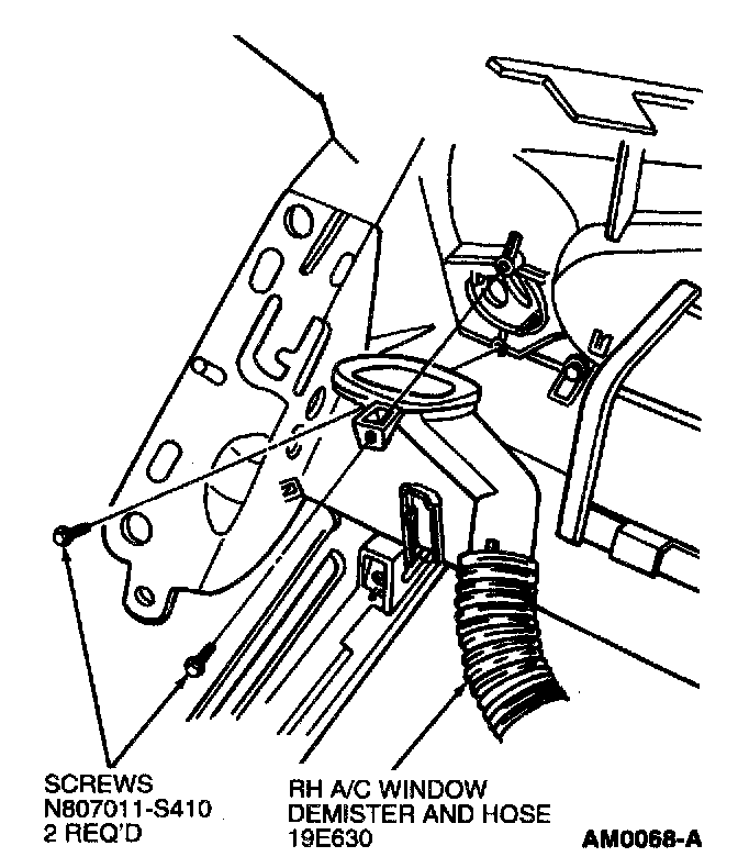 3. Remove two screws retaining RH A/C side window demister and hose to instrument panel and remove from instrument panel.