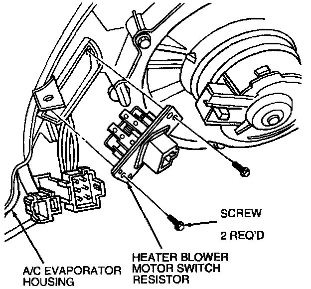 3. Remove two retaining screws and remove heater blower motor switch resistor from A/C evaporator housing.