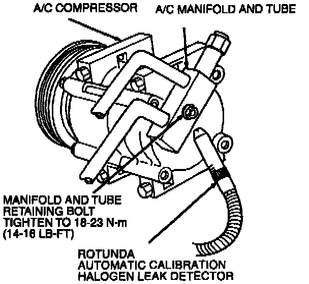 5. If a leak is found at the A/C manifold and tube and the manifold retaining bolt is tightened to 18-23 N.m (14-16 Lb-Ft), install new manifold O-ring seals. Repeat the leak test.