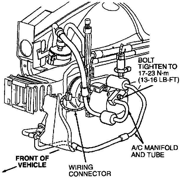 NOTE: When replacing an A/C compressor, use original manifold bolt from removed A/C compressor to attach A/C manifold and tube to new A/C compressor. Do not use the shipping cap bolts.