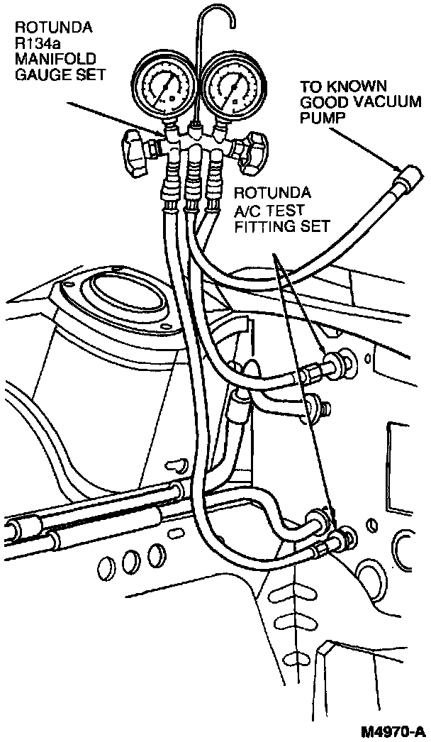 - If a small amount of vacuum is lost, operate the vacuum pump with gauge valves open or an additional 30 minutes with the system blower on low to remove any remaining refrigerant from the oil in the A/C evaporator core or A/C condenser core. Then, recheck for loss of vacuum.