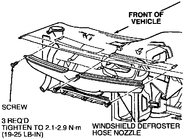 3. Remove three screws retaining windshield defroster hose nozzle to instrument panel and one screw retaining windshield defroster hose nozzle to heater air plenum chamber. Remove windshield defroster hose nozzle from instrument panel.