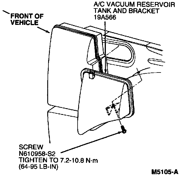2. Install A/C vacuum reservoir tank and bracket. Tighten retaining screw to 7.2-10.8 N.m (64-95 Lb-In).