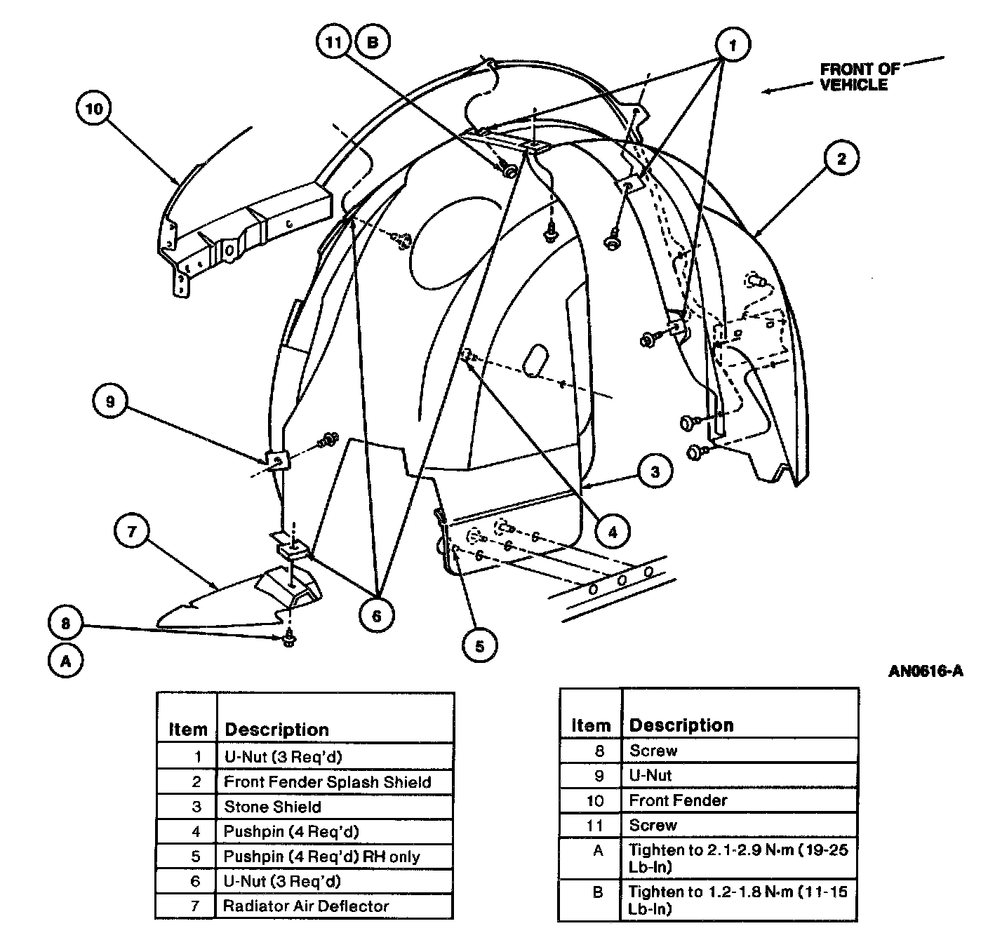 3. Install rear half of front fender splash shield with four screws and three push pins. Tighten screws to 0.6-1.0 N.m (6-8 Lb-In).