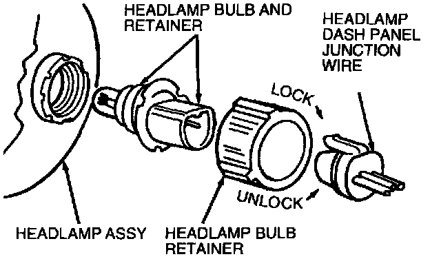 NOTE: A properly aimed headlamp assembly normally need not be re-aimed after install of bulb. A burned out headlamp bulb should not be removed from the headlamp until just before a replacement headlamp bulb is to be installed. Removal of a headlamp bulb for an extended period of time may allow contaminants (dust, moisture, smoke) to enter the headlamp and affect the performance of the headlamp. When replacing the headlamp bulb and retainer, energize the headlamp bulb only while it is contained within the headlamp body.
