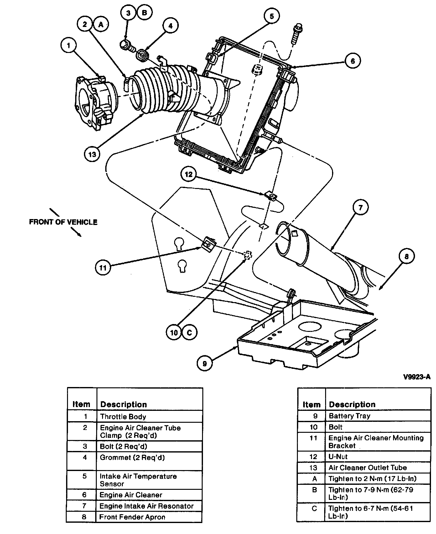 4. Align engine air cleaner grommets with J-nut and install retaining bolts. Make sure that the engine air cleaner grommets are fully seated into the air cleaner body mounting tubes with metal side of grommets up. Tighten retaining bolts to 7-9 N.m (62-79 Lb-In).