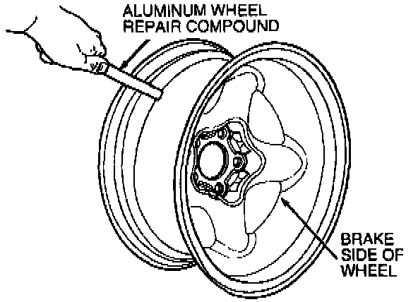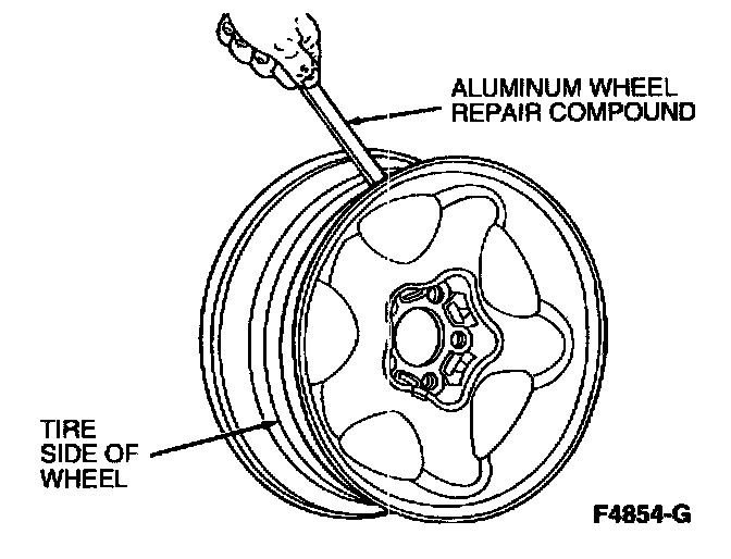 Heat the prepared area with Rotunda Heat Gun 107-R0300 or equivalent or propane torch until Aluminum Wheel Repair Compound E7AZ-19554-A or equivalent meeting Ford specification ESA-M4G280-A flows. Apply the hot melt material over the prepared area using a liberal flow and wiping action to ensure coverage of the leaking area. The service is most effective when heat is applied to the brake side of the wheel and sealer is melted by heat in the metal rim.