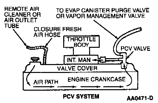 The Positive Crankcase Ventilation (PCV) System cycles crankcase gases back through the engine where they are burned. The PCV valve regulates the amount of ventilating air and blow-by gas to the intake manifold and prevents backfire from traveling into the crankcase. The PCV valve should be mounted in a vertical position. On some applications, the PCV system is connected to the evaporative emission system (refer to the VECI decal).