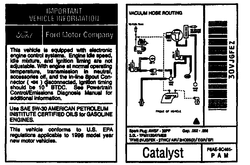 Vacuum hoses on the engine use a color stripe to aid in hose routing checks. The stripe will usually be the same color as on the Vehicle Emission Control Information (VECI) decal, but the correct vacuum hose routing must be verified by using the correct component connections shown on the VECI decal.