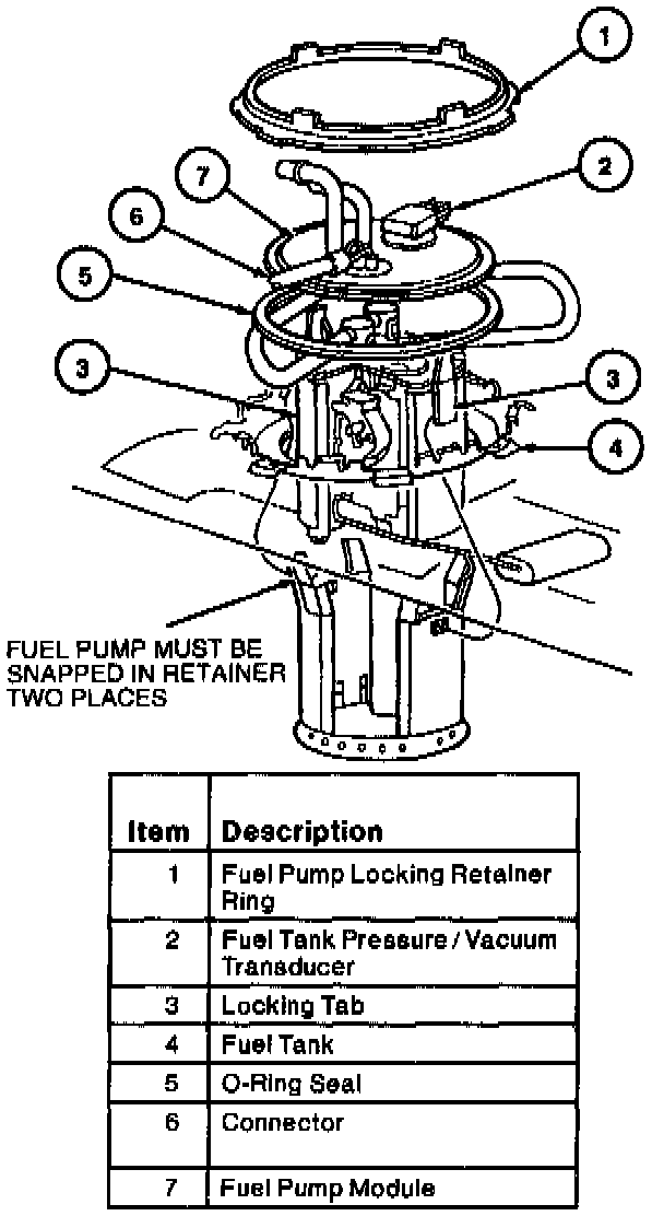 3. Install fuel pump module carefully into fuel tank to make sure that filter, hoses and float rod are not damaged or binding. Align fuel pump module and fuel tank retainer and push fuel pump module into fuel tank retainer. A definite click will be heard when the two tabs on fuel pump module engage the fuel tank retainer. The fuel pump module must be snapped in the retainer with both tabs. Pull on fuel pump module to make sure it is fully engaged. Install fuel pump module sender plate to fuel tank, being careful that locating keys are in keyways and O-ring seal remains in place.