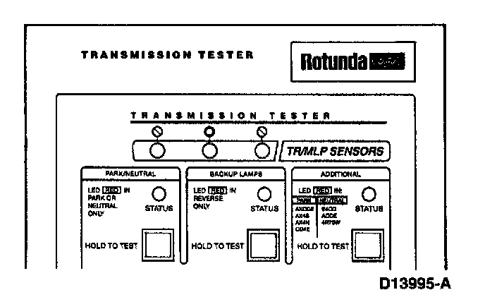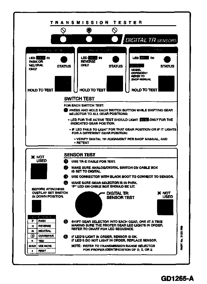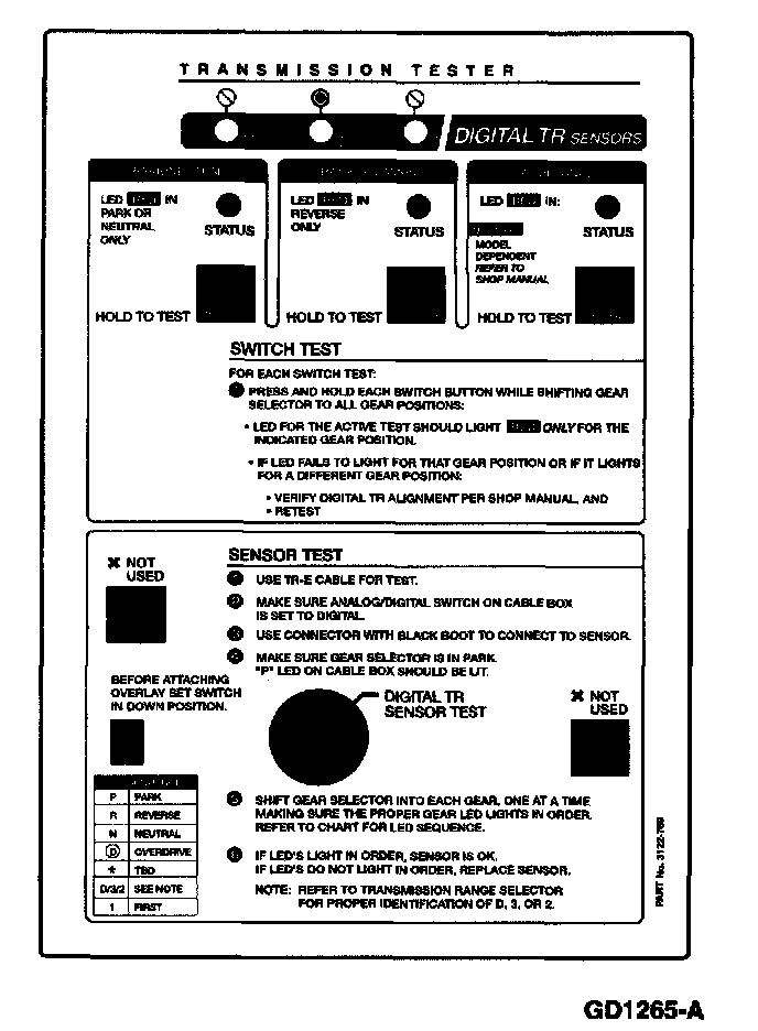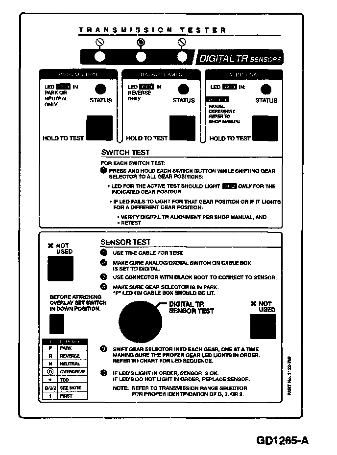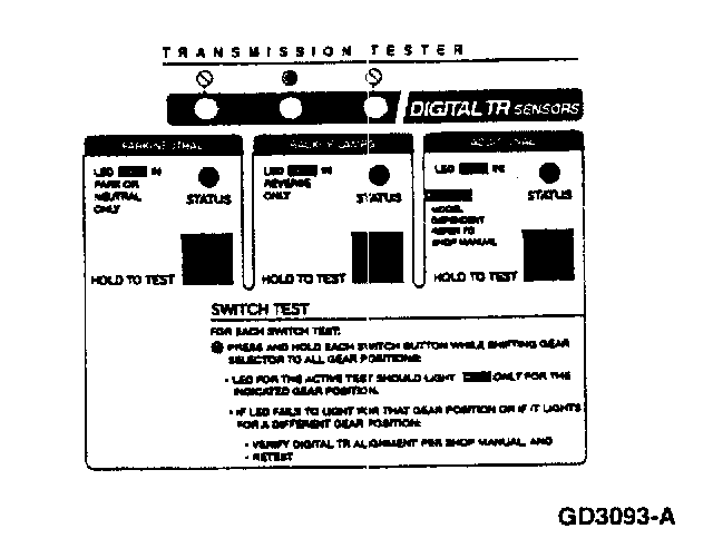 The transmission tester allows you to test the digital TR or analog TR sensors independent of the vehicle electronics. TR sensor testing is divided into five steps: