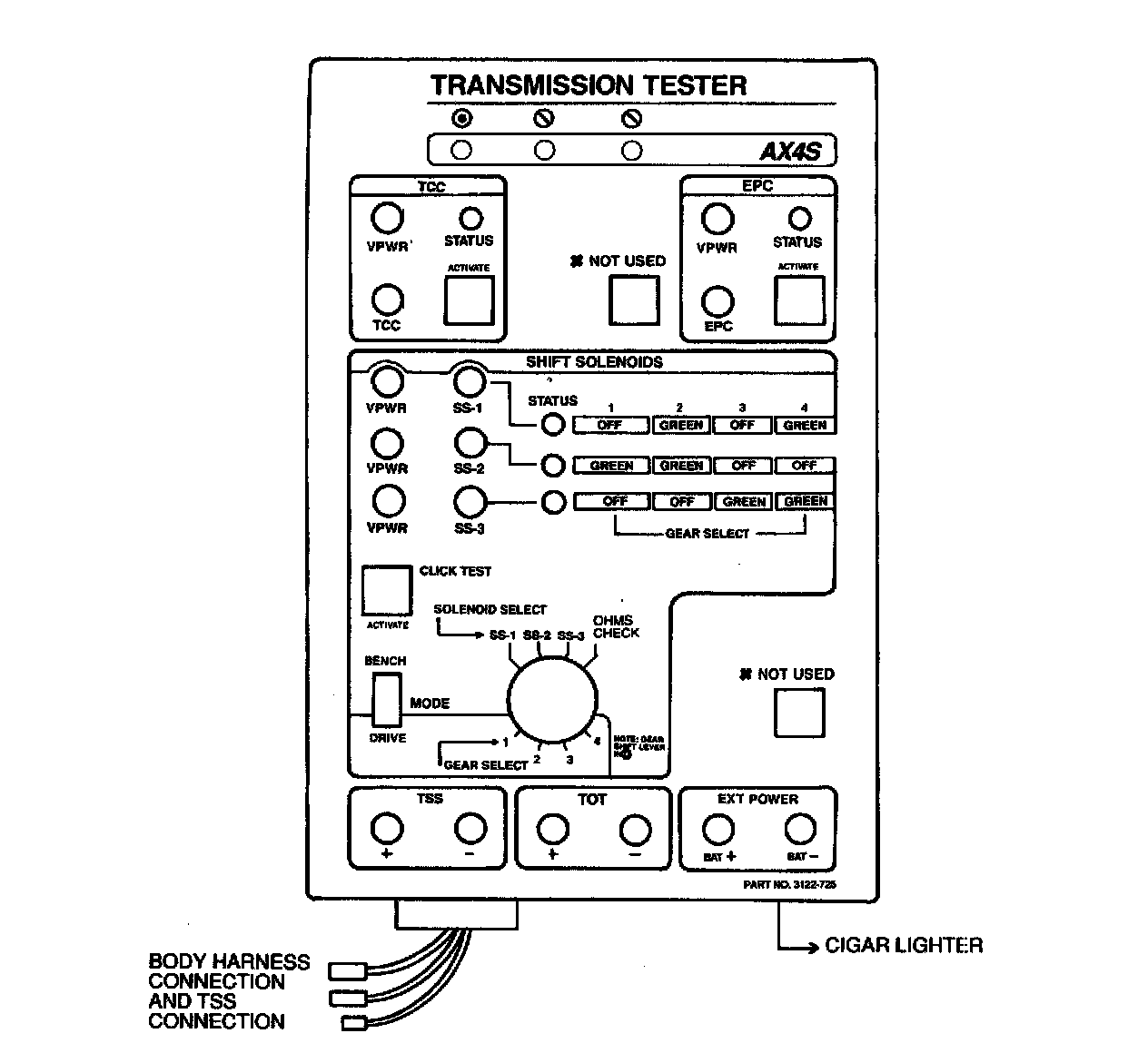 - In BENCH MODE: acts as shift solenoid selector for click testing.