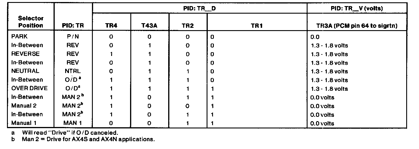- 1.8-5.0 volts = Invalid Reading (open in wires or bad resistor in digital TR sensor).