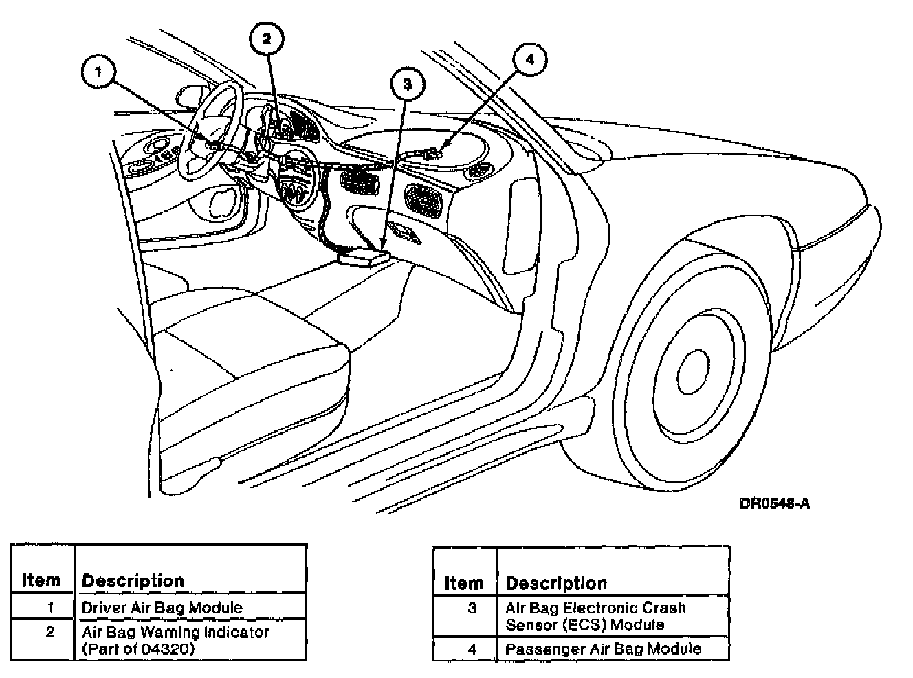The Supplemental Restraint System (SRS) contains two sensors which are contained in the air bag Electronic Crash Sensor (ECS) module. The ECS is mounted on the center tunnel under the instrument panel.