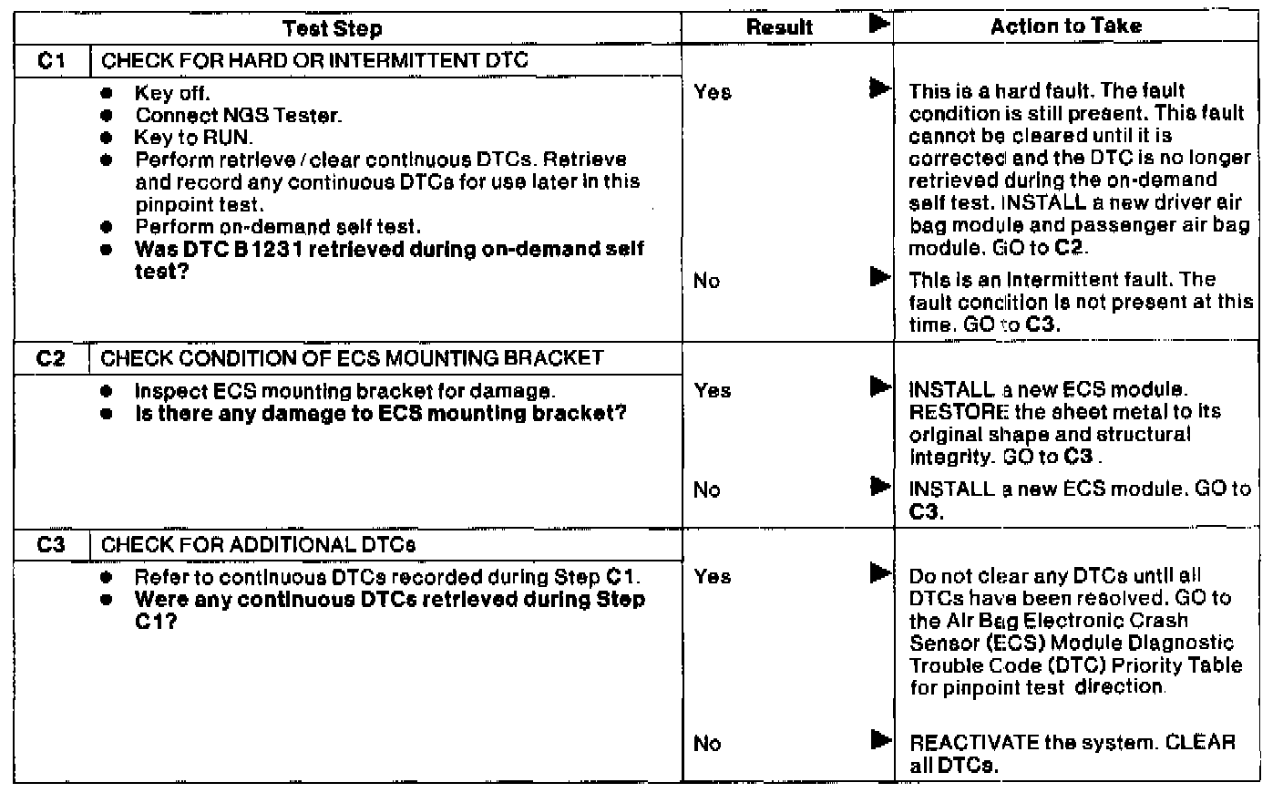 When the air bags are deployed during a collision, the air bag Electronic Crash Sensor (ECS) module will flash a Lamp Fault Code (LFC) 19 on the air bag indicator and store a Diagnostic Trouble Code (DTC) B1231 in memory. The LFC 19 and DTC B 1231 indicate that a crash has been recorded by the ECS.