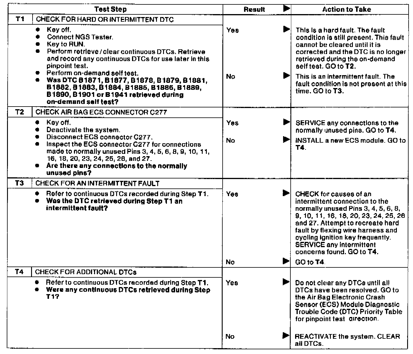 Normal OperationThe air bag Electronic Crash Sensor (ECS) module supports features which are not used in Taurus/Sable vehicles. The wiring harness pins used by the ECS for these features are normally left disconnected in Taurus/Sable vehicles. If the ECS detects a connection to Pin 3, 4, 5, 6, 8, 9, 10, 11, 16, 18, 20, 23, 24, 25, 26 or 27, it will store a Diagnostic Trouble Code (DTC) B1871, B1877, B1878, B1879, B1881, B1882, B1883, B1884, B1885, B1886, B1889, B1890, B1901 or B1941 in memory and flash a Lamp Fault Code (LFC) 14,17, 18, 25, 27, 41, 46 or 47.