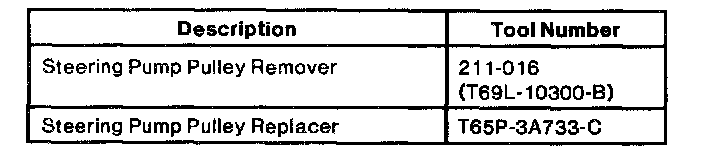 Install power steering pump pulley to power steering pump using Steering Pump Pulley Replacer 211-009 (T65P-3A733-C). Screw tool into threads in end of power steering pump shaft. Hold small nut on end of tool and turn large nut to install pulley on shaft. Install pulley face flush with pump shaft within ±0.25 mm (±0.010 inch).
