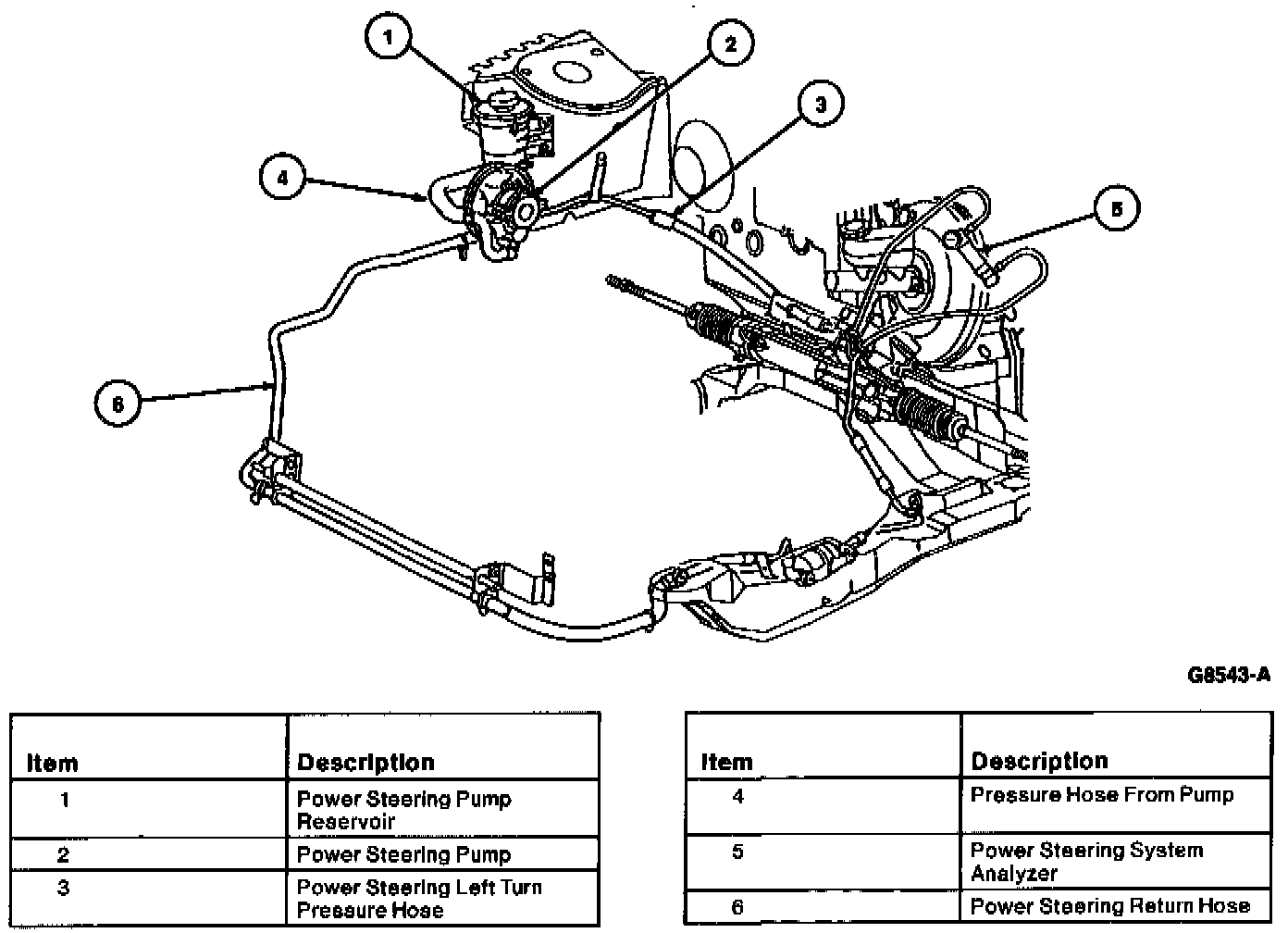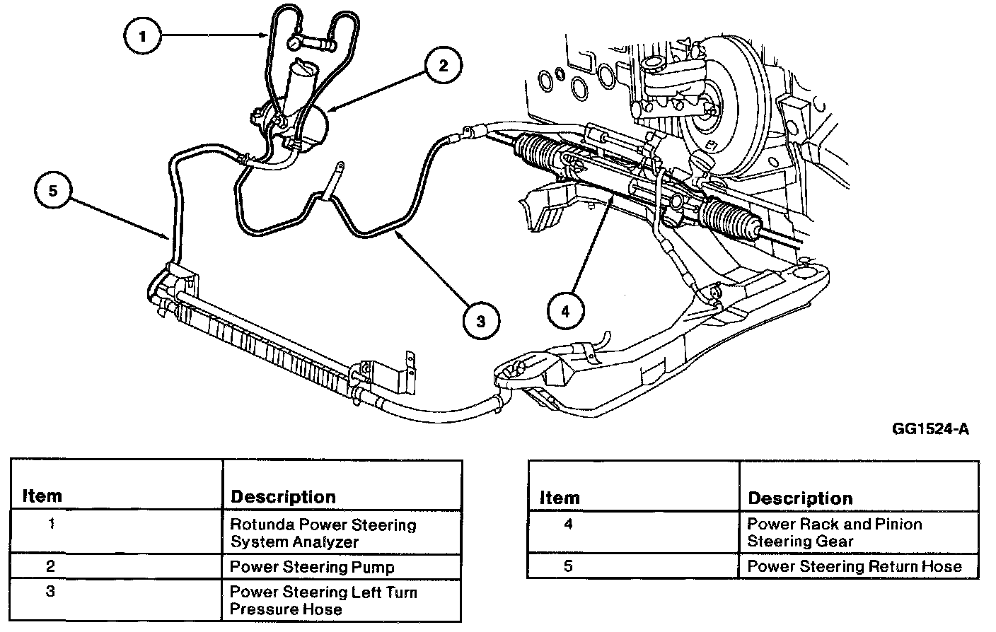 2. Disconnect the power steering pressure hose from the power steering pump and connect it into the appropriate hose adapter of the Power Steering System Analyzer 211-F001 (014-00207) or equivalent. For vehicles with 3.0L (4V) engine, use Fitting 211-D019 (014-00208) or equivalent.