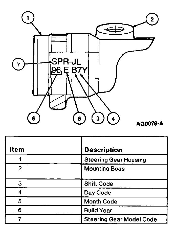 Steering gears are identified by repair identification codes stamped into the steering gear housing with the information as shown in the illustration. Identification is located on steering gear housing at opposite end of input shaft.