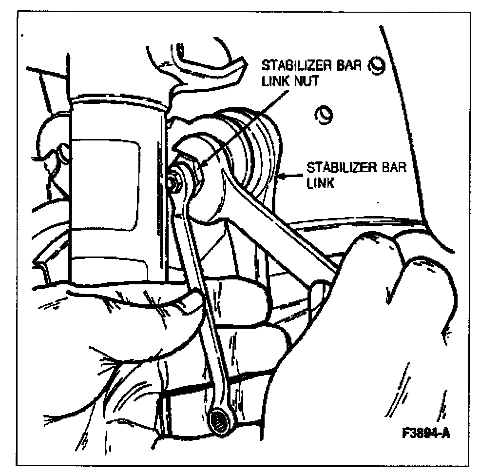 Remove and discard nuts retaining stabilizer bar link assembly to front stabilizer bar and front shock absorber with an 8 mm closed-end wrench and an 18 mm open-end wrench.