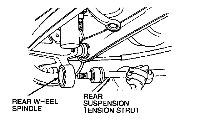 8. Remove nut, washer and rear suspension tie rod bushing retaining rear suspension tension strut and bushing to rear wheel spindle. Move rear wheel spindle rearward enough to separate it from the rear suspension tension strut and bushing.