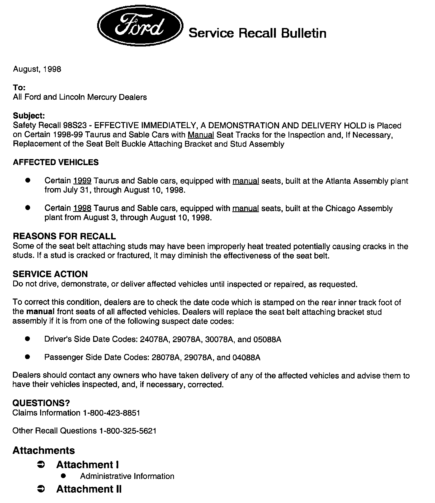 Recall - Seat Belt Buckle Attaching Stud Defect