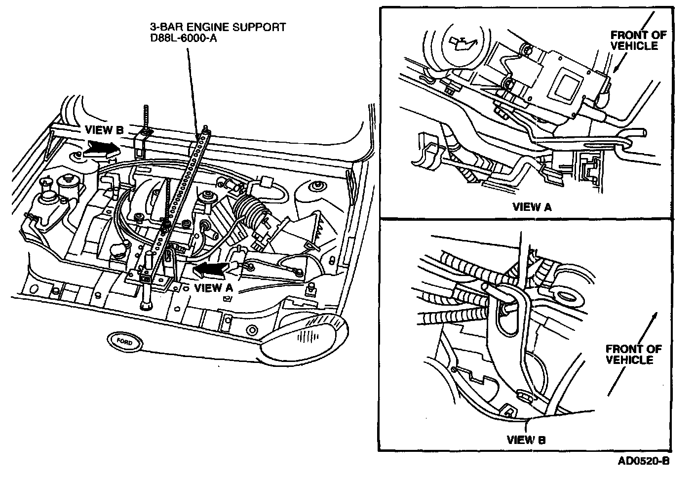 7. Install Rotunda Three Bar Engine Support D88L-6000-A or equivalent with Rotunda Engine Lifting Brackets 134-00243 (3.0L 4V) or Rotunda Engine Lifting Brackets 014-00797 (3.4L SHO) or equivalents.