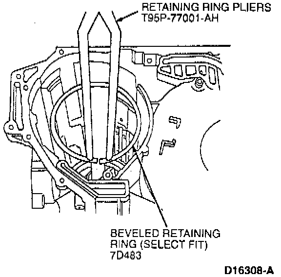Install a new service part beveled retaining ring using Retaining Ring Pliers 307-343 (T95P-77001-AH)R. Carefully tap beveled retaining ring into place. Use care not to damage retaining ring, support or case.