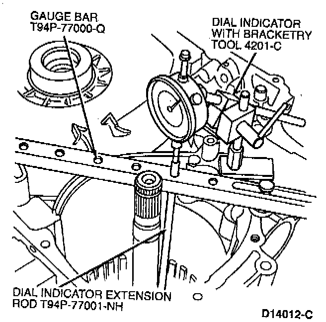 Check for correct selective fit beveled retaining ring. Place Gauge Bar 307-300 (T94P-77000-Q) across case with round legs of gauge bar resting on chain cover gasket surface. Place Dial Indicator Extension Rod 307-320 (T94P-77001-MH) through hole in gauge bar.