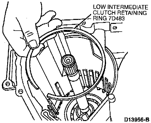 14. CAUTION: If support is not visible on inside diameter of retaining ring, the low/intermediate piston could be damaged.