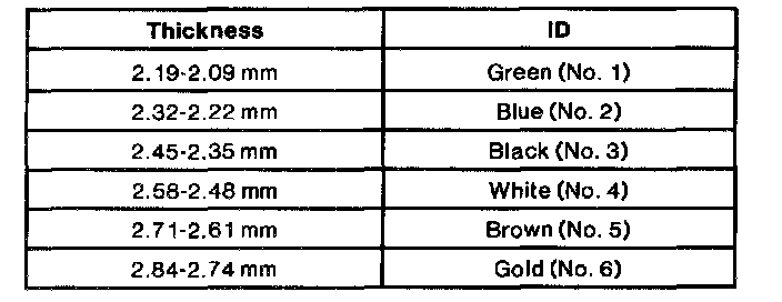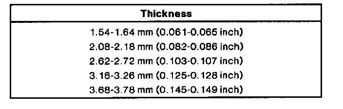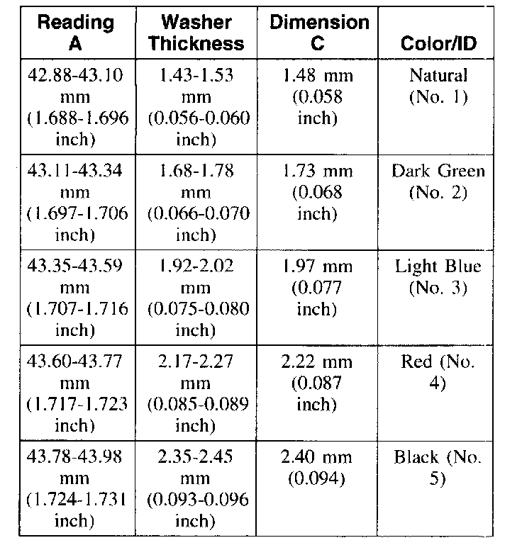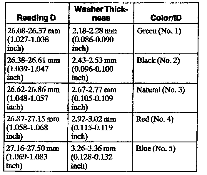 Dial indicator reading should be 0.10-0.40 mm (0.004-0.016 inch). If clearance is not within specification, select a thicker or thinner washer from chart below and repeat the clearance check.