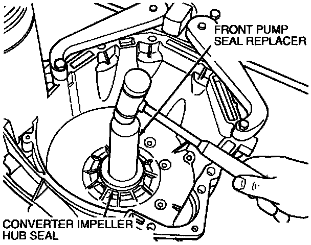 6. Install converter impeller hub seal using Front Pump Seal Replacer 307-186 (T87L-77337-AH) and a dead blow (lead-filled) hammer.